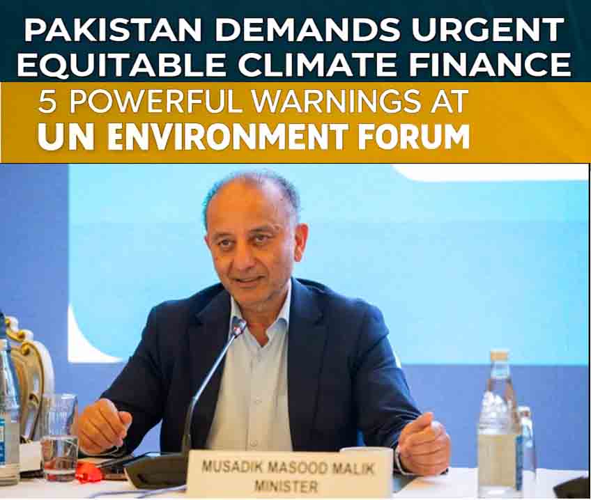 Pakistan calls for equitable climate finance at the UN Environment Forum as Federal Minister Dr Musadik Malik warns that environmental degradation poses systemic risks to the global financial system and vulnerable economies.